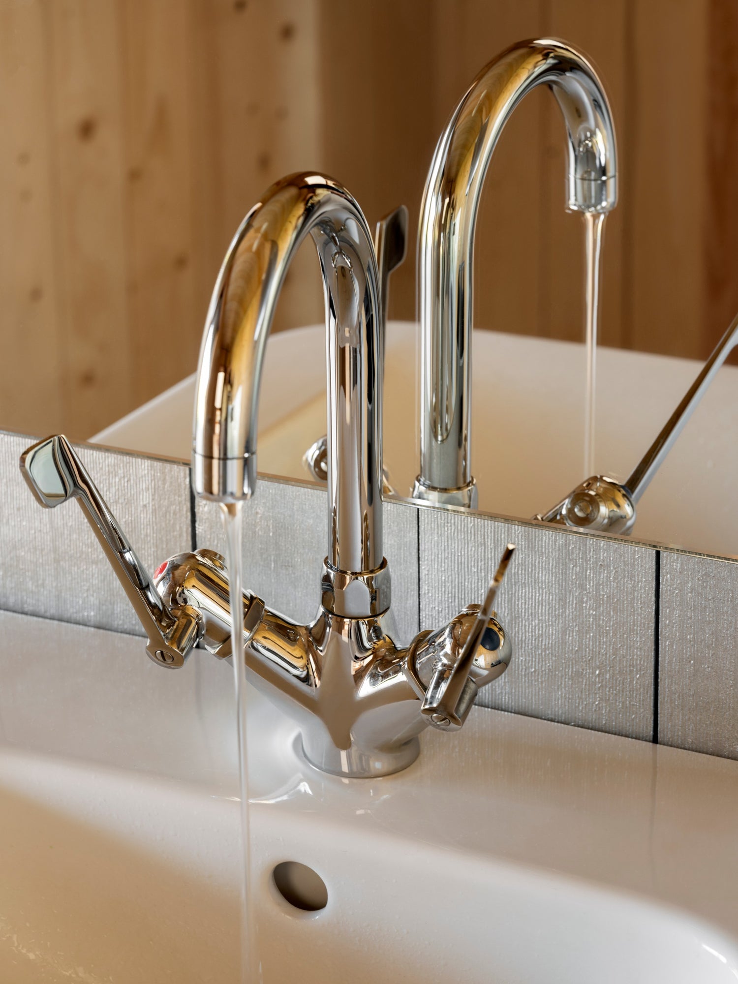 En klassisk løsning hvor varmt og koldt vand styres via to separate greb.