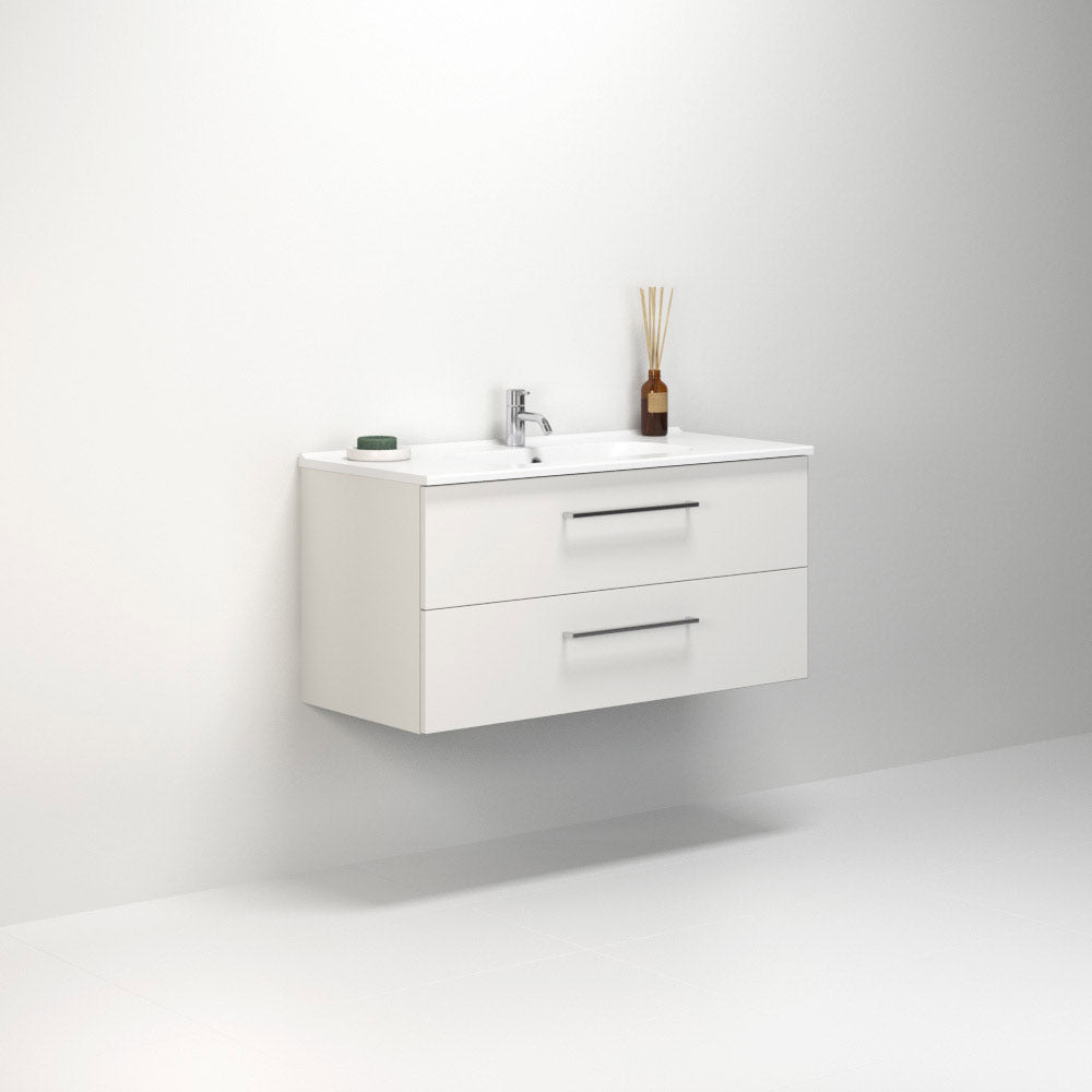 Sidder nuværende rørinstallation uden på væggen, er det ikke muligt at vælge et skuffeskab. Kontakt os derfor gerne for anden mulighed