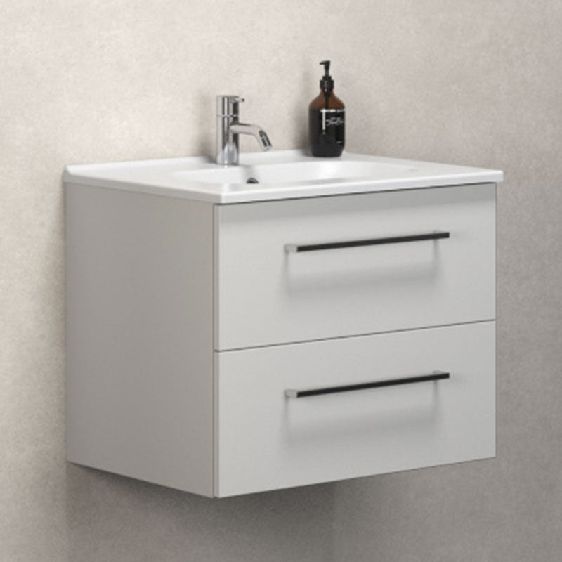 Dansani Luna badeværelsesmøbel fås med to forskellige håndvaske – Kantate porcelæns håndvask og Minore Solid Surface håndvask. Badeværelsesmøbelet fås i to højder - 48 og 64 cm og i 4 størrelser – 60, 80, 100 og 120 cm. Luna badeværelsesmøbel er udstyret med 2 skuffer med softclose. Det stilrene badeværelsesmøbel findes i 4 flotte farver – hvid mat, hvid højglans, grå mat og brun eg og har standard base greb ved alle størrelser, men det er muligt at tilkøbe andre greb, hvis det ønskes. Se udvalget af greb muligheder på sidste billede. Alle Luna fronter med træ-dekor består af en melaminbelagt spånplade, der egner sig perfekt til et fugtigt miljø. Pladen består af 2/3 dele genbrugstræ og er derfor et mere bæredygtigt valg.