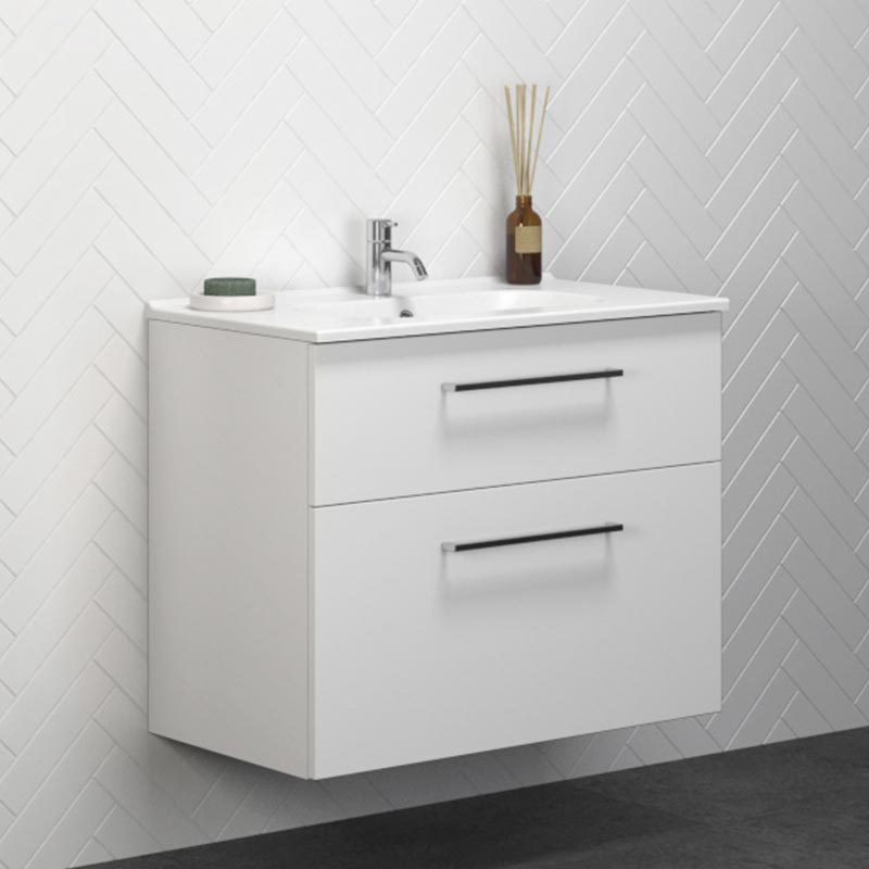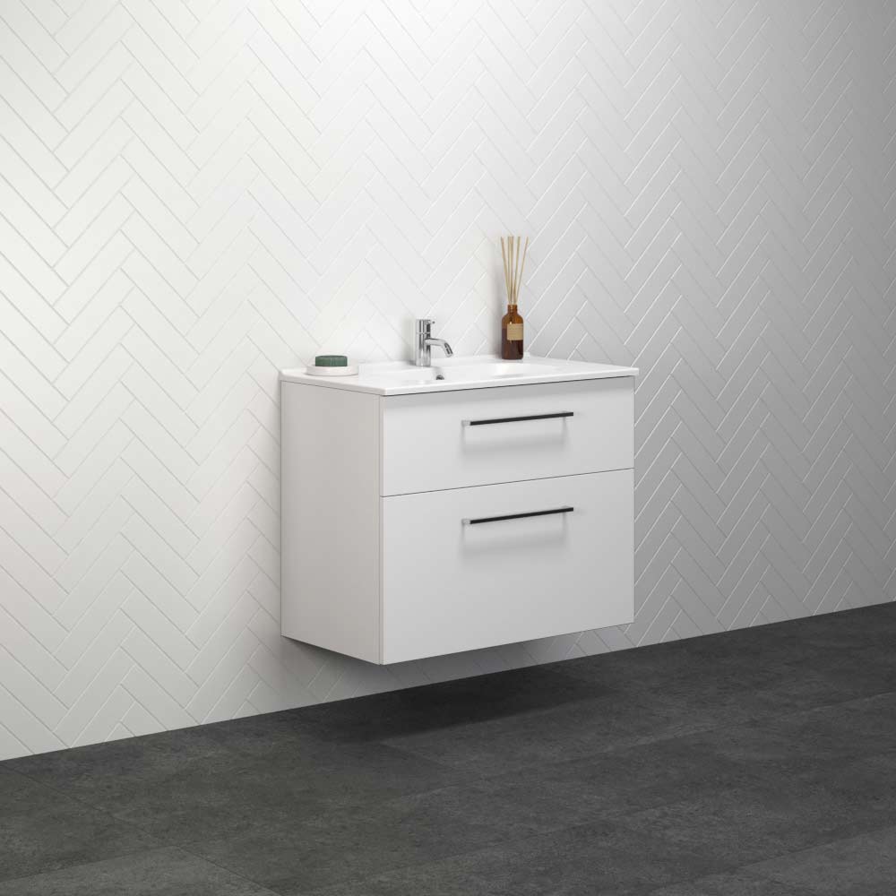 Dansani Luna badeværelsesmøbel fås med to forskellige håndvaske – Kantate porcelæns håndvask og Minore Solid Surface håndvask. Badeværelsesmøbelet fås i to højder - 48 og 64 cm og i 4 størrelser – 60, 80, 100 og 120 cm. Luna badeværelsesmøbel er udstyret med 2 skuffer med softclose. Det stilrene badeværelsesmøbel findes i 4 flotte farver – hvid mat, hvid højglans, grå mat og brun eg og har standard base greb ved alle størrelser, men det er muligt at tilkøbe andre greb, hvis det ønskes. Se udvalget af greb muligheder på sidste billede. Alle Luna fronter med træ-dekor består af en melaminbelagt spånplade, der egner sig perfekt til et fugtigt miljø. Pladen består af 2/3 dele genbrugstræ og er derfor et mere bæredygtigt valg.