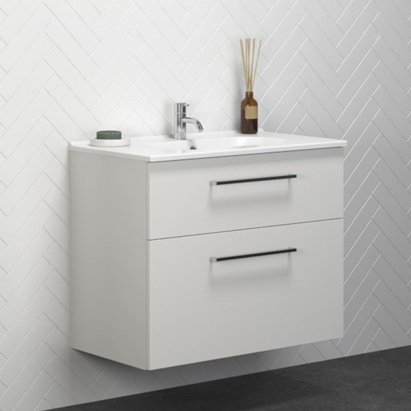 Dansani Luna badeværelsesmøbel fås med to forskellige håndvaske – Kantate porcelæns håndvask og Minore Solid Surface håndvask. Badeværelsesmøbelet fås i to højder - 48 og 64 cm og i 4 størrelser – 60, 80, 100 og 120 cm. Luna badeværelsesmøbel er udstyret med 2 skuffer med softclose. Det stilrene badeværelsesmøbel findes i 4 flotte farver – hvid mat, hvid højglans, grå mat og brun eg og har standard base greb ved alle størrelser, men det er muligt at tilkøbe andre greb, hvis det ønskes. Se udvalget af greb muligheder på sidste billede. Alle Luna fronter med træ-dekor består af en melaminbelagt spånplade, der egner sig perfekt til et fugtigt miljø. Pladen består af 2/3 dele genbrugstræ og er derfor et mere bæredygtigt valg.