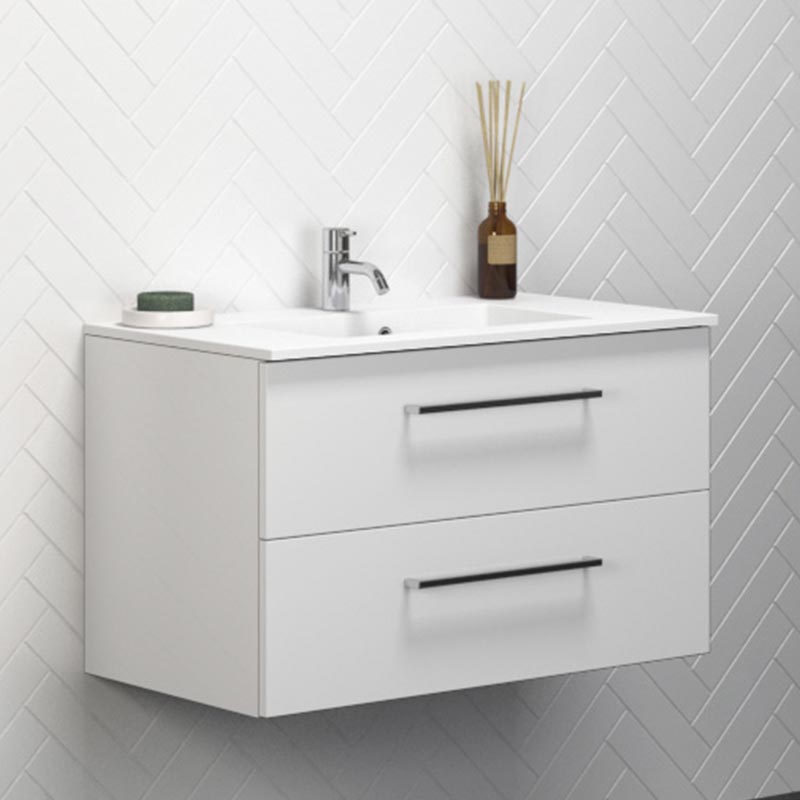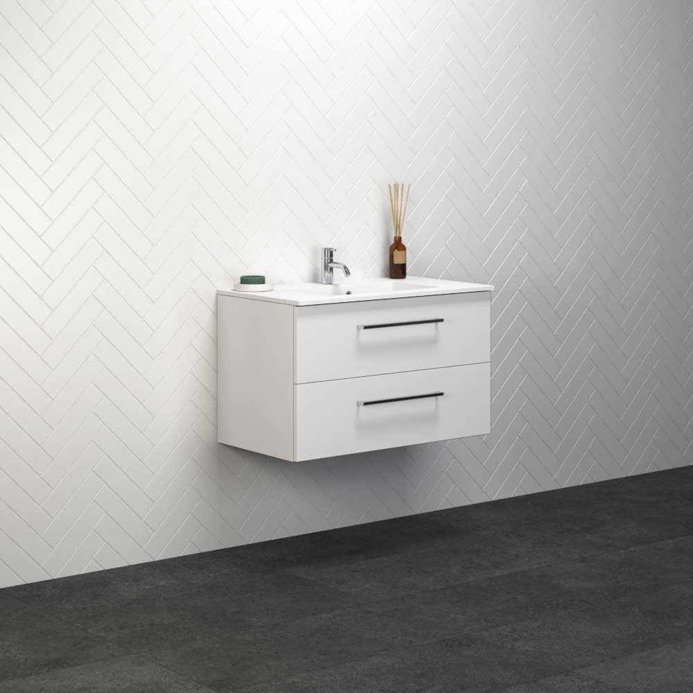 Dansani Luna badeværelsesmøbel fås med to forskellige håndvaske – Kantate porcelæns håndvask og Minore Solid Surface håndvask. Badeværelsesmøbelet fås i to højder - 48 og 64 cm og i 4 størrelser – 60, 80, 100 og 120 cm. Luna badeværelsesmøbel er udstyret med 2 skuffer med softclose. Det stilrene badeværelsesmøbel findes i 4 flotte farver – hvid mat, hvid højglans, grå mat og brun eg og har standard base greb ved alle størrelser, men det er muligt at tilkøbe andre greb, hvis det ønskes. Se udvalget af greb muligheder på sidste billede. Alle Luna fronter med træ-dekor består af en melaminbelagt spånplade, der egner sig perfekt til et fugtigt miljø. Pladen består af 2/3 dele genbrugstræ og er derfor et mere bæredygtigt valg.