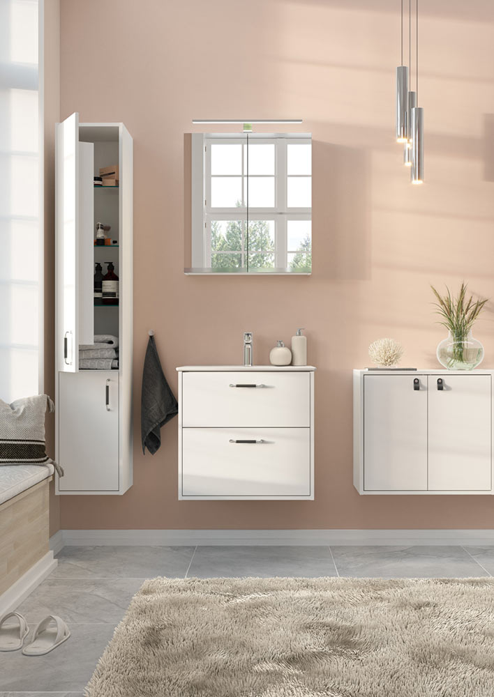 Sidder nuværende rørinstallation uden på væggen, er det ikke muligt at vælge et skuffeskab. Kontakt os derfor gerne for anden mulighed
