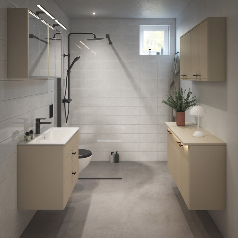 Tidløs stil og smart opbevaring med Gustavsberg Graphic badeværelsesmøbler med vask i beige. Køb baderumsmøbler med pris inkl. montering her.
