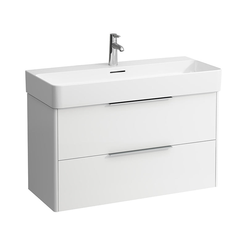 Badeværelsesmøbel med 2 rummelige skuffer inkl. Val håndvask på 95 cm. Skufferne i underskabet er udstyret med Soft Close-beslag og forkromede håndtag, som sikrer en god komfort på badeværelset. Møblet er slidstærkt, overfladen er UV-bestandig og med den særlige folie samt ABS-hjørner, tåler de alle de udfordringer som dagligdagen byder på på badeværelset. Manden bag Val-kollektionen er den tyskfødte designer, Konstantin Grcic, der igennem en fusion af pragmatik og design har udviklet en af de mest populære serier i Laufens kartotek. Med respekt for materialerne og elegante former, har Konstantin Grcic udviklet en minimalistisk og optimeret serie, der byder på gode løsninger til alle badeværelser.