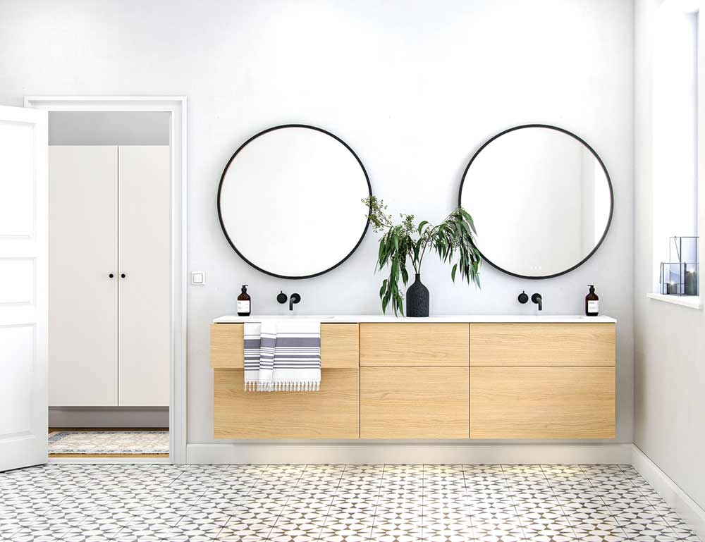 Er elinstallationen ikke gemt bag spejlet trækkes der et synligt kabel langs væggen